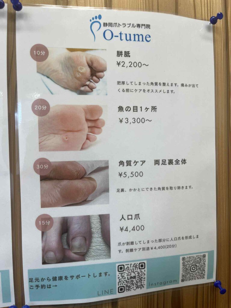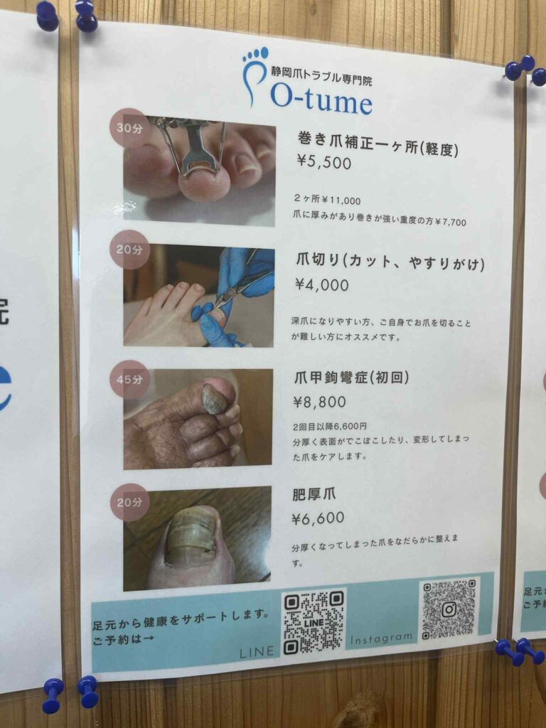 O-tume 静岡爪トラブル専門 施術内容のご案内です(^^) ・巻き爪補正 ・爪切り ・爪甲鉤彎症—-爪が分厚くてボコボコに変形地てしまった爪のケア ・肥厚爪 ・タコや魚の目の除去 ・角質ケア ・人口爪—–爪のトラブルでボロボロになってしまった爪への施術 様々な爪のトラブルへの施術が可能です!お気軽にご相談下さい! いきいき接骨院